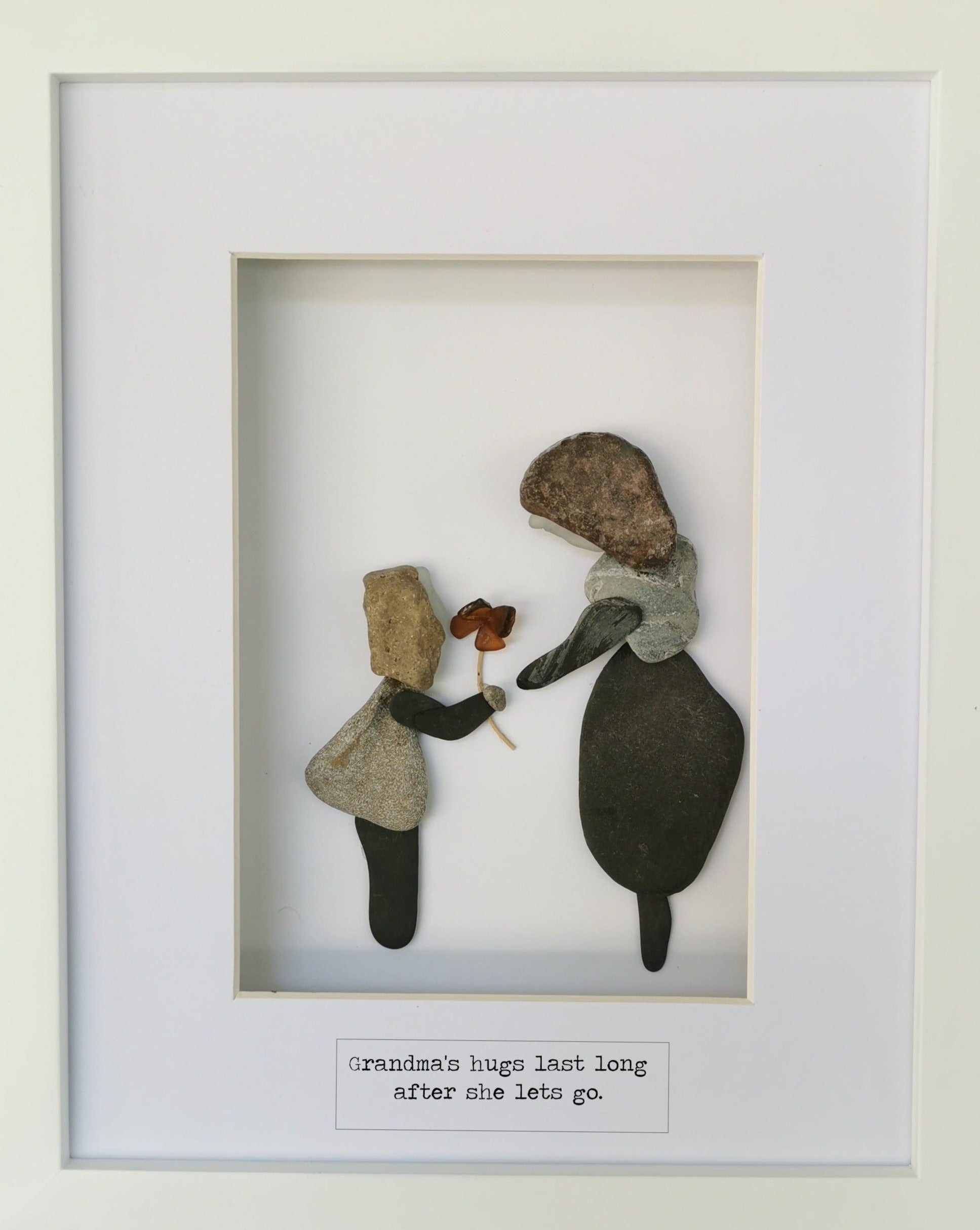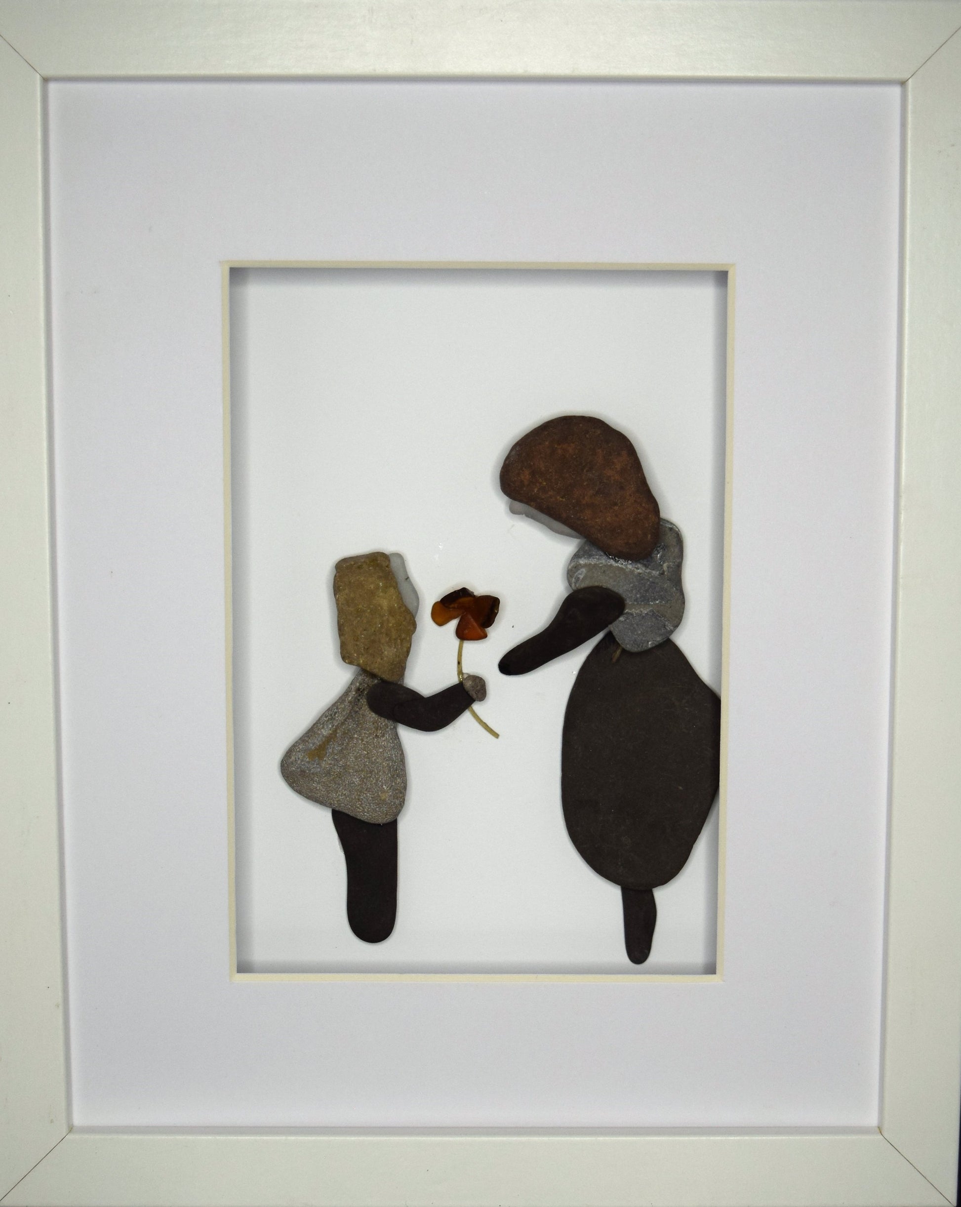 The flower is and the child's and lady's profile is made out of sea glass. The beautiful markings of the stones make this piece truly unique.