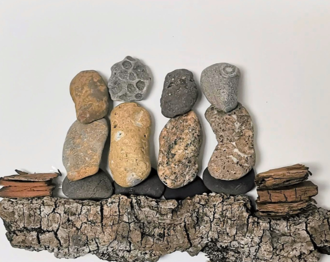 These four ladies are made of unique fossils, just like each one of us, each stone is one of a kind. The four ladies are sitting on a piece of driftwood and have books one each side.