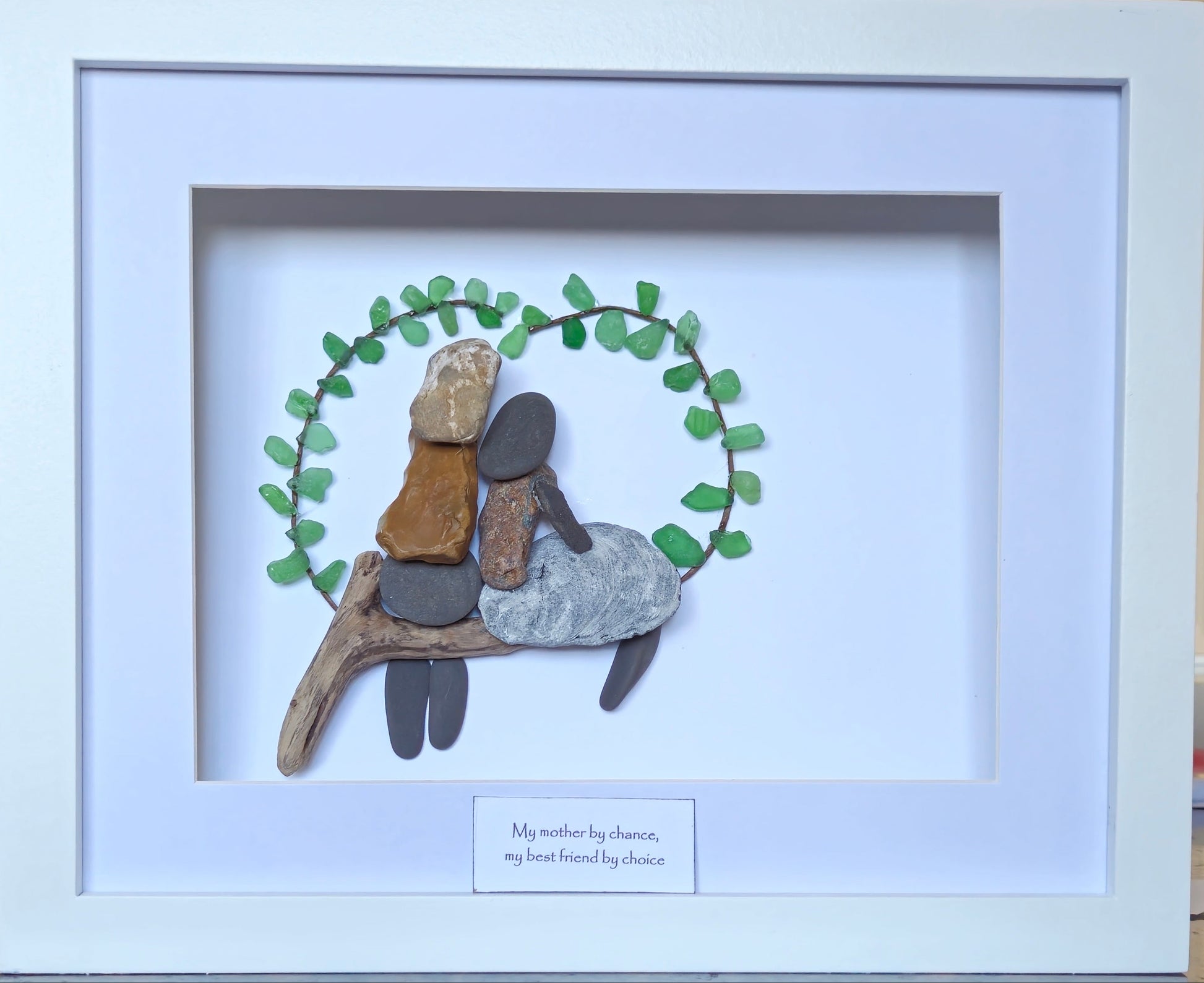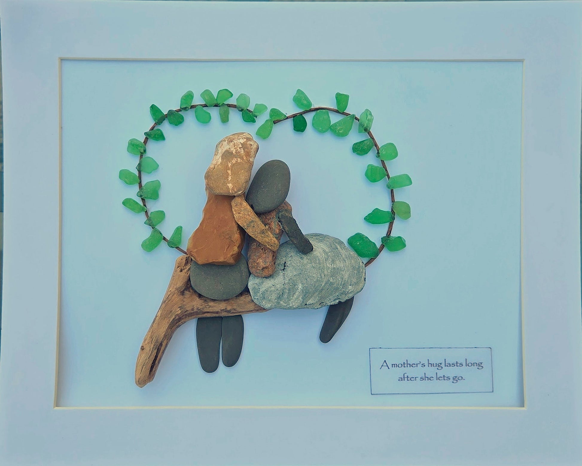 A mother and daughter sit together on driftwood, encircled by a sea glass branch that forms the shape of a heart—an embrace of love and belonging. Their figures are shaped from hand-picked stones, each one unique, each one bearing the marks of its own journey, just as every relationship is shaped by time, tenderness, and experience. Beneath them, the words speak what the stones already echo: “My mother by chance, my best friend by choice.”