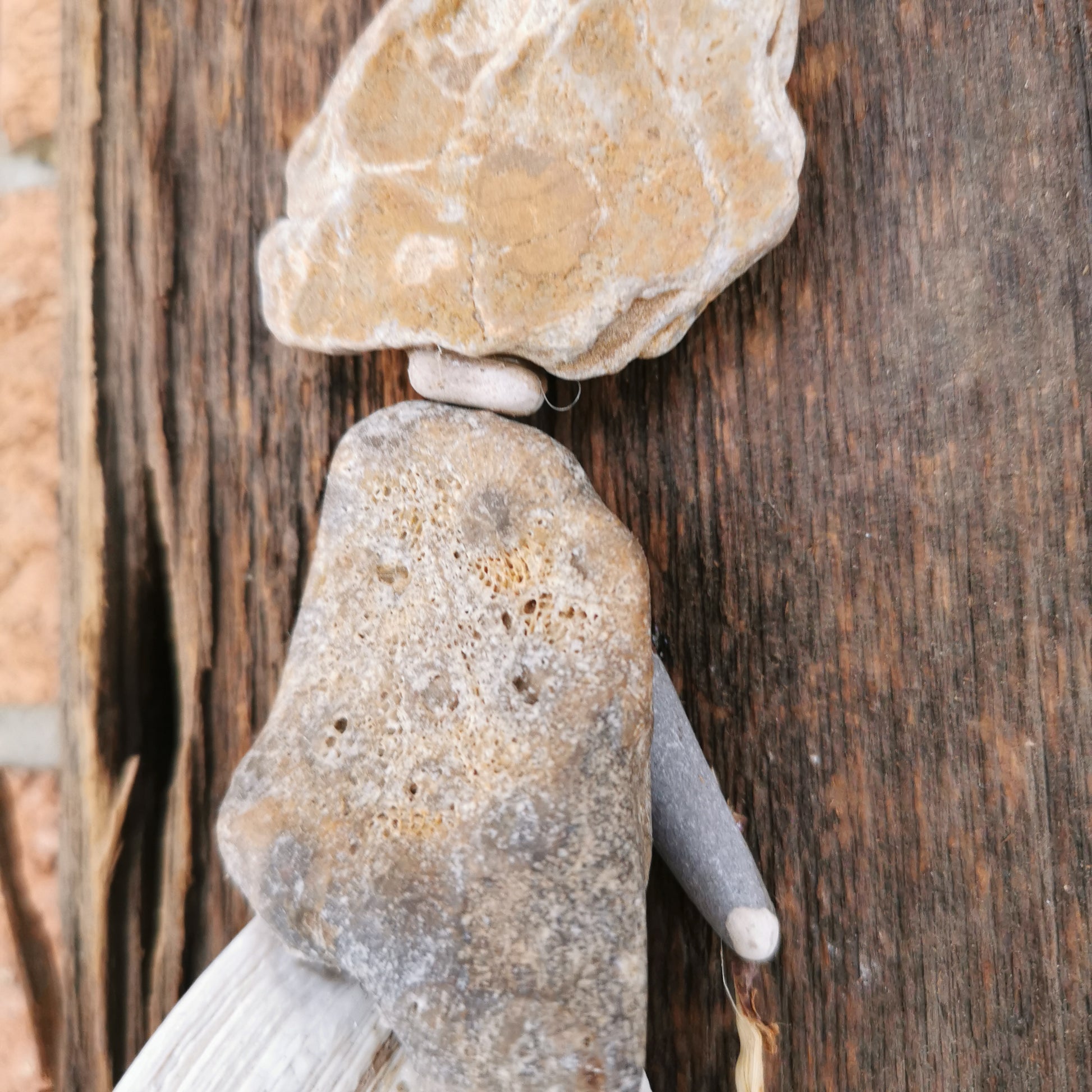 Most of the stones are from the Canadian Great Lakes. The girl's blouse is a "Petoskey Stone" which is a rock and a fossil, often pebble-shaped, that is composed of a fossilized rugose coral.