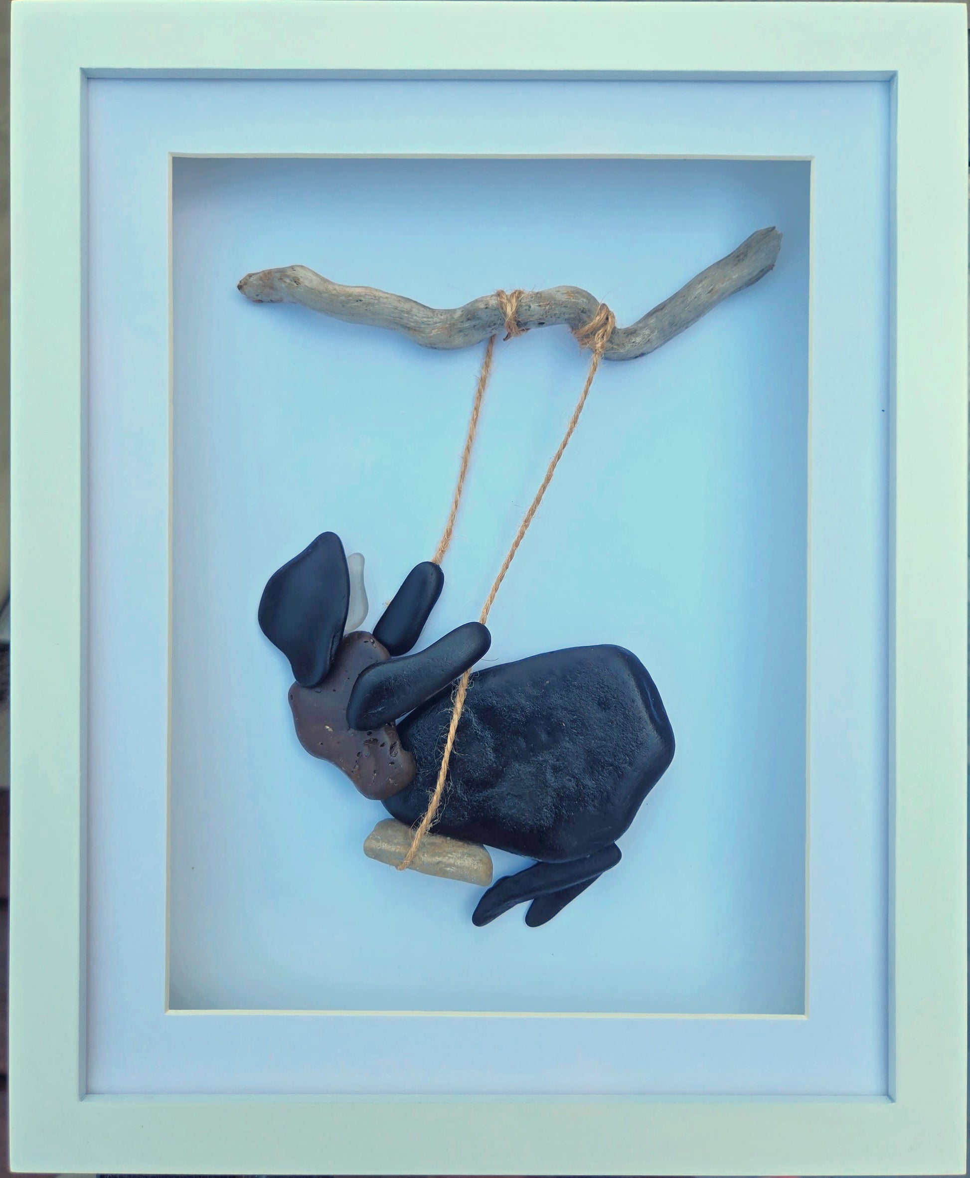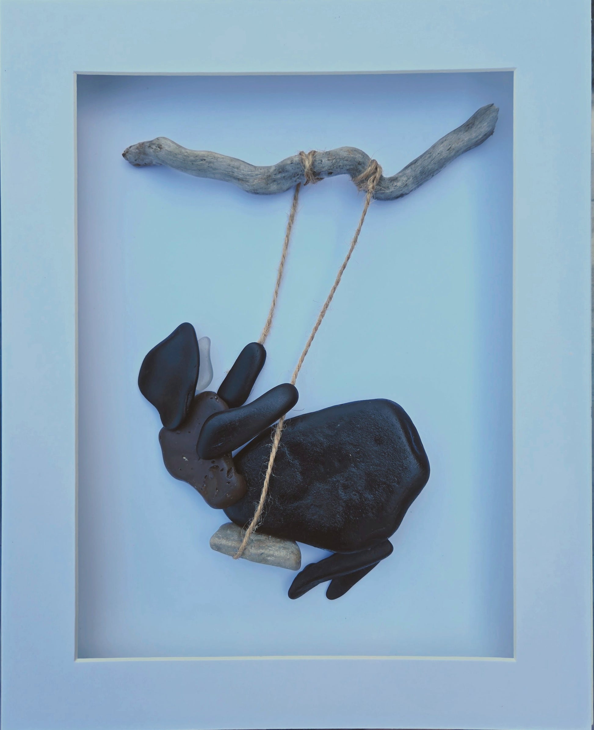 This whimsical artwork captures the carefree joy of childhood. Her profile is formed from a thick piece of sea glass found on the shores of Argentina, while her bonnet, arms, and flowing skirt are naturally shaped shale stones gathered from Lake Huron. Each stone carries its own character, shaped and smoothed by the tides, creating a figure that feels both timeless and full of life.