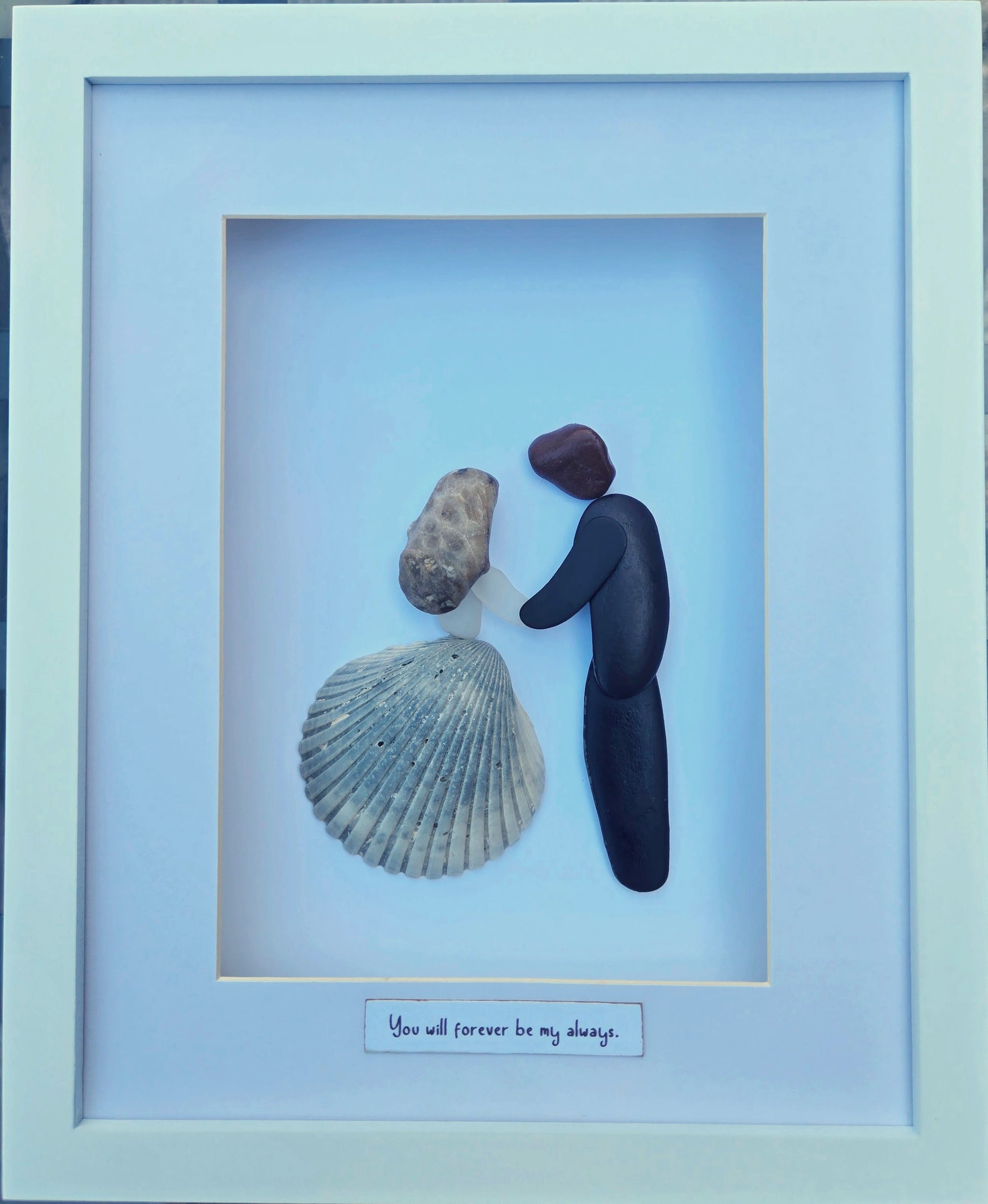 A tender moment captured in stone and shell—two figures holding hands in quiet devotion. Her flowing skirt is a shell gathered from Argentina, her graceful form shaped from sea glass, and her hair a natural Petoskey stone, rich with ancient patterns. Beside her, he is formed from smooth shale stones, steadfast and strong. Together, they embody the promise inscribed beneath them: “You will forever be my always.”